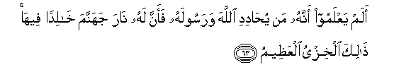 63. Alam yaAAlamoo annahu man yuhadidi Allaha warasoolahu faanna lahu nara jahannama khalidan feeha thalika alkhizyu alAAatheemu