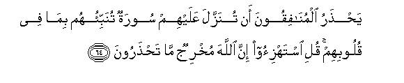 64. Yahtharu almunafiqoona an tunazzala AAalayhim sooratun tunabbi-ohum bima fee quloobihim quli istahzi-oo inna Allaha mukhrijun ma tahtharoona