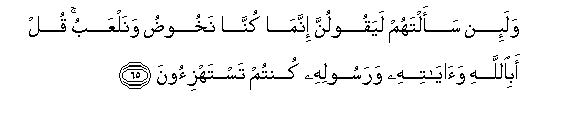 65. Wala-in saaltahum layaqoolunna innama kunna nakhoodu wanalAAabu qul abiAllahi waayatihi warasoolihi kuntum tastahzi-oona