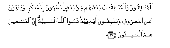 67. Almunafiqoona waalmunafiqatu baAAduhum min baAAdin ya/muroona bialmunkari wayanhawna AAani almaAAroofi wayaqbidoona aydiyahum nasoo Allaha fanasiyahum inna almunafiqeena humu alfasiqoona