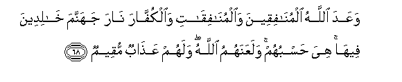 68. WaAAada Allahu almunafiqeena waalmunafiqati waalkuffara nara jahannama khalideena feeha hiya hasbuhum walaAAanahumu Allahu walahum AAathabun muqeemun