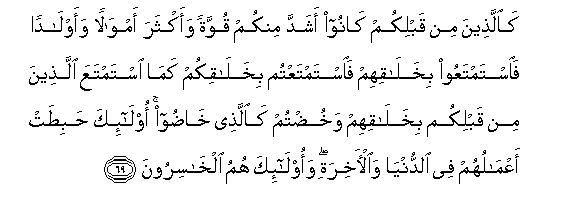 69. Kaallatheena min qablikum kanoo ashadda minkum quwwatan waakthara amwalan waawladan faistamtaAAoo bikhalaqihim faistamtaAAtum bikhalaqikum kama istamtaAAa allatheena min qablikum bikhalaqihim wakhudtum kaallathee khadoo ola-ika habitat aAAmaluhum fee alddunya waal-akhirati waola-ika humu alkhasiroona
