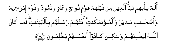 70. Alam ya/tihim nabao allatheena min qablihim qawmi noohin waAAadin wathamooda waqawmi ibraheema waas-habi madyana waalmu/tafikati atat-hum rusuluhum bialbayyinati fama kana Allahu liyathlimahum walakin kanoo anfusahum yathlimoona