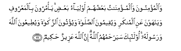 71. Waalmu/minoona waalmu/minatu baAAduhum awliyao baAAdin ya/muroona bialmaAAroofi wayanhawna AAani almunkari wayuqeemoona alssalata wayu/toona alzzakata wayuteeAAoona Allaha warasoolahu ola-ika sayarhamuhumu Allahu inna Allaha AAazeezun hakeemun