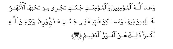 72. WaAAada Allahu almu/mineena waalmu/minati jannatin tajree min tahtiha al-anharu khalideena feeha wamasakina tayyibatan fee jannati AAadnin waridwanun mina Allahi akbaru thalika huwa alfawzu alAAatheemu