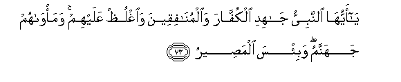 73. Ya ayyuha alnnabiyyu jahidi alkuffara waalmunafiqeena waoghluth AAalayhim wama/wahum jahannamu wabi/sa almaseeru