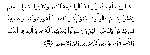 74. Yahlifoona biAllahi ma qaloo walaqad qaloo kalimata alkufri wakafaroo baAAda islamihim wahammoo bima lam yanaloo wama naqamoo illa an aghnahumu Allahu warasooluhu min fadlihi fa-in yatooboo yaku khayran lahum wa-in yatawallaw yuAAaththibhumu Allahu AAathaban aleeman fee alddunya waal-akhirati wama lahum fee al-ardi min waliyyin wala naseerin
