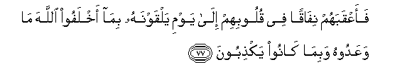 77. FaaAAqabahum nifaqan fee quloobihim ila yawmi yalqawnahu bima akhlafoo Allaha ma waAAadoohu wabima kanoo yakthiboona