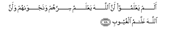 78. Alam yaAAlamoo anna Allaha yaAAlamu sirrahum wanajwahum waanna Allaha AAallamu alghuyoobi
