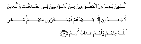 79. Allatheena yalmizoona almuttawwiAAeena mina almu/mineena fee alssadaqati waallatheena la yajidoona illa juhdahum fayaskharoona minhum sakhira Allahu minhum walahum AAathabun aleemun
