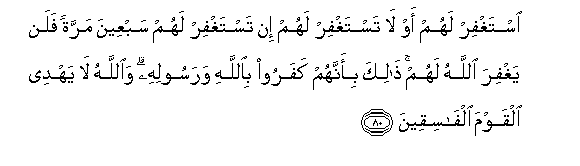 80. Istaghfir lahum aw la tastaghfir lahum in tastaghfir lahum sabAAeena marratan falan yaghfira Allahu lahum thalika bi-annahum kafaroo biAllahi warasoolihi waAllahu la yahdee alqawma alfasiqeena