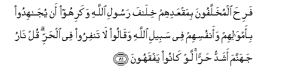 81. Fariha almukhallafoona bimaqAAadihim khilafa rasooli Allahi wakarihoo an yujahidoo bi-amwalihim waanfusihim fee sabeeli Allahi waqaloo la tanfiroo fee alharri qul naru jahannama ashaddu harran law kanoo yafqahoona