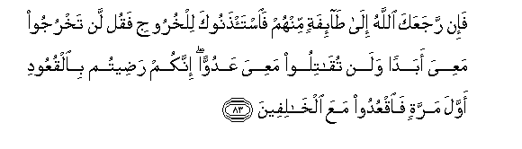 83. Fa-in rajaAAaka Allahu ila ta-ifatin minhum faista/thanooka lilkhurooji faqul lan takhrujoo maAAiya abadan walan tuqatiloo maAAiya AAaduwwan innakum radeetum bialquAAoodi awwala marratin faoqAAudoo maAAa alkhalifeena