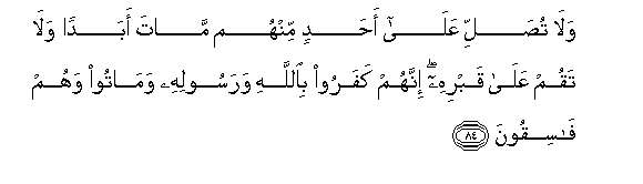 84. Wala tusalli AAala ahadin minhum mata abadan wala taqum AAala qabrihi innahum kafaroo biAllahi warasoolihi wamatoo wahum fasiqoona