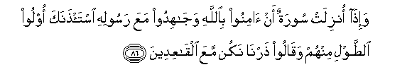 86. Wa-itha onzilat sooratun an aminoo biAllahi wajahidoo maAAa rasoolihi ista/thanaka oloo alttawli minhum waqaloo tharna nakun maAAa alqaAAideena