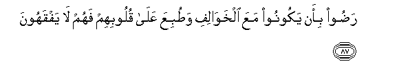 87. Radoo bi-an yakoonoo maAAa alkhawalifi watubiAAa AAala quloobihim fahum la yafqahoona