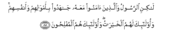 88. Lakini alrrasoolu waallatheena amanoo maAAahu jahadoo bi-amwalihim waanfusihim waola-ika lahumu alkhayratu waola-ika humu almuflihoona