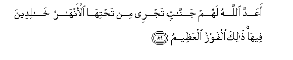 89. aAAadda Allahu lahum jannatin tajree min tahtiha al-anharu khalideena feeha thalika alfawzu alAAatheemu