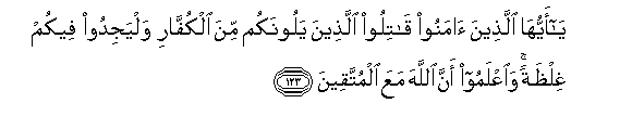 123. Ya ayyuha allatheena amanoo qatiloo allatheena yaloonakum mina alkuffari walyajidoo feekum ghilthatan waiAAlamoo anna Allaha maAAa almuttaqeena