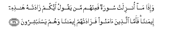 124. Wa-itha ma onzilat sooratun faminhum man yaqoolu ayyukum zadat-hu hathihi eemanan faamma allatheena amanoo fazadat-hum eemanan wahum yastabshiroona