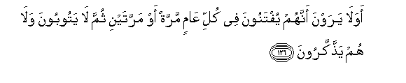 126. Awa la yarawna annahum yuftanoona fee kulli AAamin marratan aw marratayni thumma la yatooboona wala hum yaththakkaroona