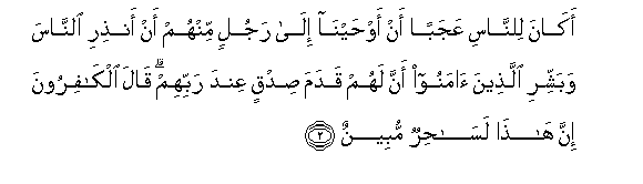 2. Akana lilnnasi AAajaban an awhayna ila rajulin minhum an anthiri alnnasa wabashshiri allatheena amanoo anna lahum qadama sidqin AAinda rabbihim qala alkafiroona inna hatha lasahirun mubeenun