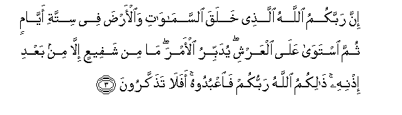 3. Inna rabbakumu Allahu allathee khalaqa alssamawati waal-arda fee sittati ayyamin thumma istawa AAala alAAarshi yudabbiru al-amra ma min shafeeAAin illa min baAAdi ithnihi thalikumu Allahu rabbukum faoAAbudoohu afala tathakkaroona