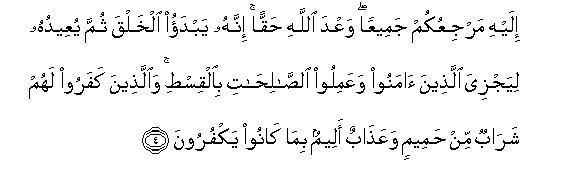 4. Ilayhi marjiAAukum jameeAAan waAAda Allahi haqqan innahu yabdao alkhalqa thumma yuAAeeduhu liyajziya allatheena amanoo waAAamiloo alssalihati bialqisti waallatheena kafaroo lahum sharabun min hameemin waAAathabun aleemun bima kanoo yakfuroona