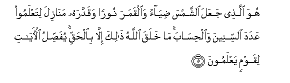 5. Huwa allathee jaAAala alshshamsa diyaan waalqamara nooran waqaddarahu manazila litaAAlamoo AAadada alssineena waalhisaba ma khalaqa Allahu thalika illa bialhaqqi yufassilu al-ayati liqawmin yaAAlamoona