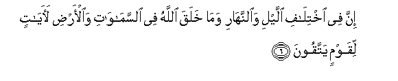 6. Inna fee ikhtilafi allayli waalnnahari wama khalaqa Allahu fee alssamawati waal-ardi laayatin liqawmin yattaqoona