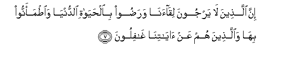7. Inna allatheena la yarjoona liqaana waradoo bialhayati alddunya waitmaannoo biha waallatheena hum AAan ayatina ghafiloona