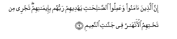 9. Inna allatheena amanoo waAAamiloo alssalihati yahdeehim rabbuhum bi-eemanihim tajree min tahtihimu al-anharu fee jannati alnnaAAeemi