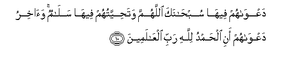 10. DaAAwahum feeha subhanaka allahumma watahiyyatuhum feeha salamun waakhiru daAAwahum ani alhamdu lillahi rabbi alAAalameena