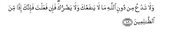 106. "'Nor call on any, other than Allah.- Such will neither profit thee nor hurt thee: if thou dost, behold! thou shalt certainly be of those who do wrong.'"