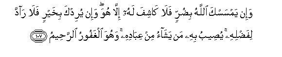 107. Wa-in yamsaska Allahu bidurrin fala kashifa lahu illa huwa wa-in yuridka bikhayrin fala radda lifadlihi yuseebu bihi man yashao min AAibadihi wahuwa alghafooru alrraheemu