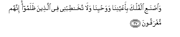 37. "But construct an Ark under Our eyes and Our inspiration, and address Me no (further) on behalf of those who are in sin: for they are about to be overwhelmed (in the Flood)."