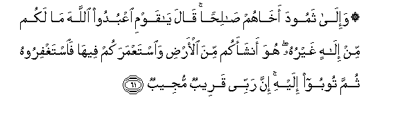 61. To the Thamud People (We sent) Salih, one of their own brethren. He said: "O my people! Worship Allah. ye have no other god but Him. It is He Who hath produced you from the earth and settled you therein: then ask forgiveness of Him, and turn to Him (in repentance): for my Lord is (always) near, ready to answer."