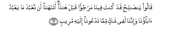 62. Qaloo ya salihu qad kunta feena marjuwwan qabla hatha atanhana an naAAbuda ma yaAAbudu abaona wa-innana lafee shakkin mimma tadAAoona ilayhi mureebun