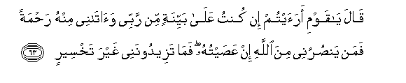 63. Qala ya qawmi araaytum in kuntu AAala bayyinatin min rabbee waatanee minhu rahmatan faman yansurunee mina Allahi in AAasaytuhu fama tazeedoonanee ghayra takhseerin