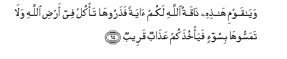64. Waya qawmi hathihi naqatu Allahi lakum ayatan fatharooha ta/kul fee ardi Allahi wala tamassooha bisoo-in faya/khuthakum AAathabun qareebun