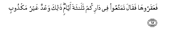 65. But they did ham-string her. So he said: "Enjoy yourselves in your homes for three days: (Then will be your ruin): (Behold) there a promise not to be belied!"