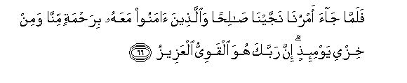 66. Falamma jaa amruna najjayna salihan waallatheena amanoo maAAahu birahmatin minna wamin khizyi yawmi-ithin inna rabbaka huwa alqawiyyu alAAazeezu
