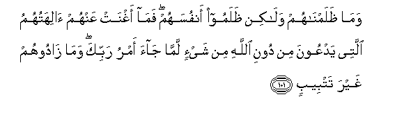101. Wama thalamnahum walakin thalamoo anfusahum fama aghnat AAanhum alihatuhumu allatee yadAAoona min dooni Allahi min shay-in lamma jaa amru rabbika wama zadoohum ghayra tatbeebin