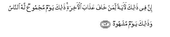 103. Inna fee thalika laayatan liman khafa AAathaba al-akhirati thalika yawmun majmooAAun lahu alnnasu wathalika yawmun mashhoodun