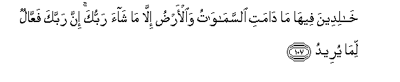 107. Khalideena feeha ma damati alssamawatu waal-ardu illa ma shaa rabbuka inna rabbaka faAAAAalun lima yureedu