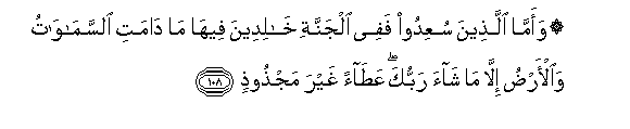108. Waamma allatheena suAAidoo fafee aljannati khalideena feeha ma damati alssamawatu waal-ardu illa ma shaa rabbuka AAataan ghayra majthoothin