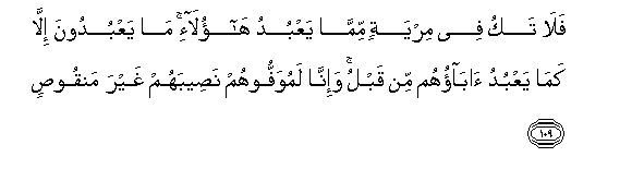 109. Fala taku fee miryatin mimma yaAAbudu haola-i ma yaAAbudoona illa kama yaAAbudu abaohum min qablu wa-inna lamuwaffoohum naseebahum ghayra manqoosin