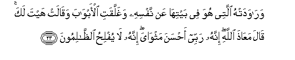 23. Warawadat-hu allatee huwa fee baytiha AAan nafsihi waghallaqati al-abwaba waqalat hayta laka qala maAAatha Allahi innahu rabbee ahsana mathwaya innahu la yuflihu alththalimoona