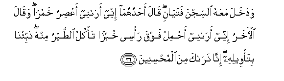 36. Wadakhala maAAahu alssijna fatayani qala ahaduhuma innee aranee aAAsiru khamran waqala al-akharu innee aranee ahmilu fawqa ra/see khubzan ta/kulu alttayru minhu nabbi/na bita/weelihi inna naraka mina almuhsineena