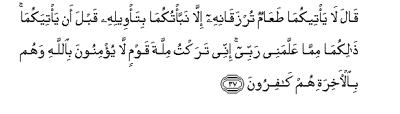 37. Qala la ya/teekuma taAAamun turzaqanihi illa nabba/tukuma bita/weelihi qabla an ya/tiyakuma thalikuma mimma AAallamanee rabbee innee taraktu millata qawmin la yu/minoona biAllahi wahum bial-akhirati hum kafiroona